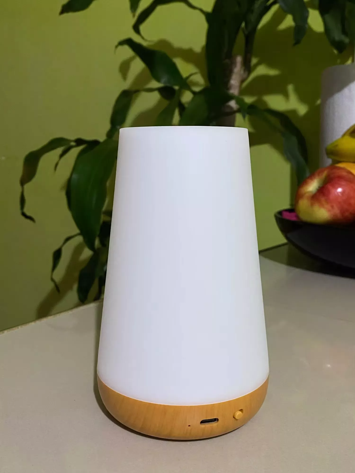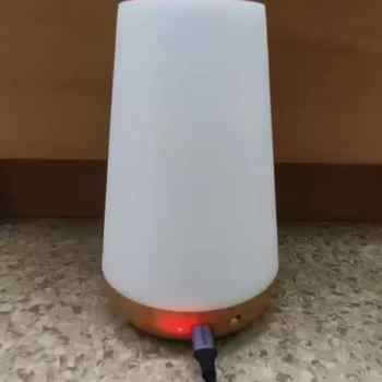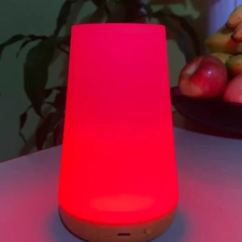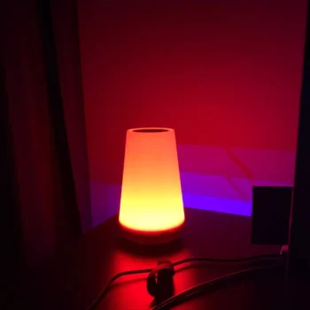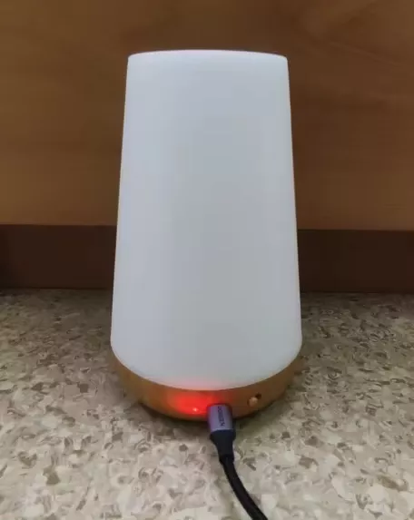 This lampshade is very beautiful has internal battery the light of it is very nice has several kinds of colors every time you touch on top color change second it turns off and has a power off Button