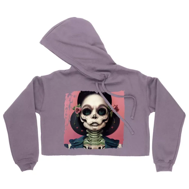 3D Skull Women’s Cropped Fleece Hoodie – Skeleton Cropped Hoodie for Women – Halloween Themed Hooded Sweatshirt