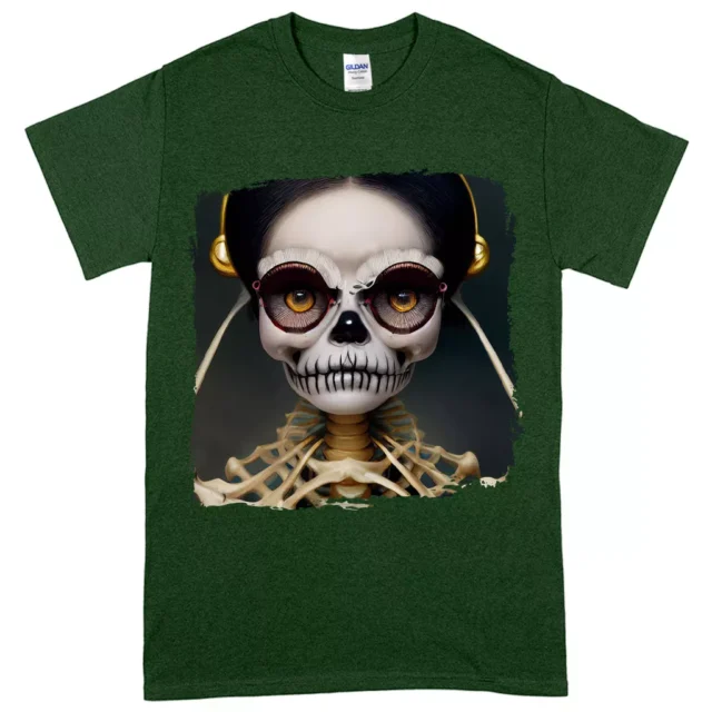 Skeleton Print Heavy Cotton T-Shirt – Halloween Themed Tee Shirt – Creepy Girl T-Shirt