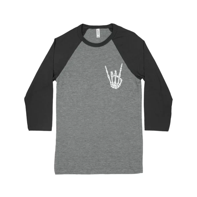 Skeleton Sign of the Horns Unisex 3/4 Sleeve Baseball T-Shirt is no ordinary piece of clothing. Its contrast raglan sleeves, two-tone trim, and side-seamed detailing provide a retail fit for clothing that’s true to size.