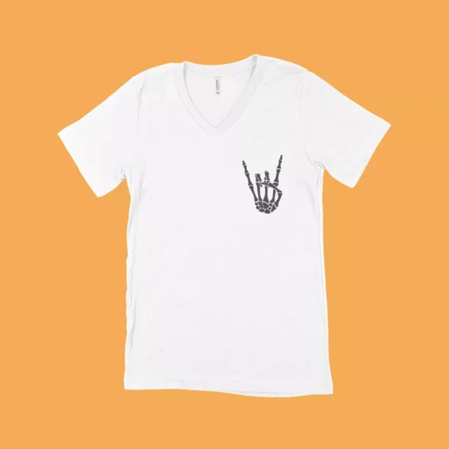 Looking for a relaxed and comfortable t-shirt? Look no further than Skeleton Sign of the Horns Unisex Jersey V-Neck T-Shirt. Made from soft and lightweight fabric, Skeleton Sign of the Horns Unisex Jersey V-Neck T-Shirt is perfect for everyday wear. And with a stylish v-neck design, it’s sure to turn heads too!