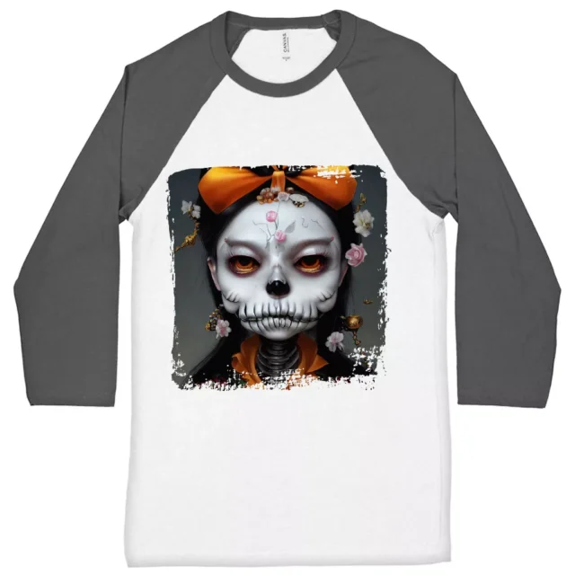 Skull Print Baseball T-Shirt – Novelty Skeleton T-Shirt – Creepy Girl Tee Shirt