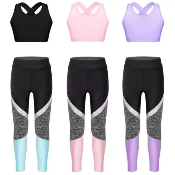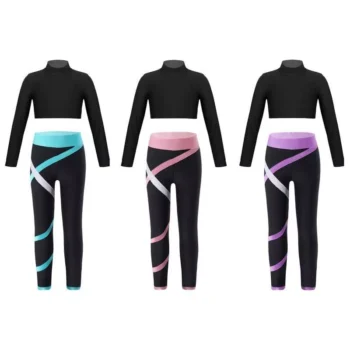 Kids’ Athletic Wear Set – Stretchy Long Sleeve Crop Top & Colorblock Leggings for Gymnastics, Yoga, Skating
